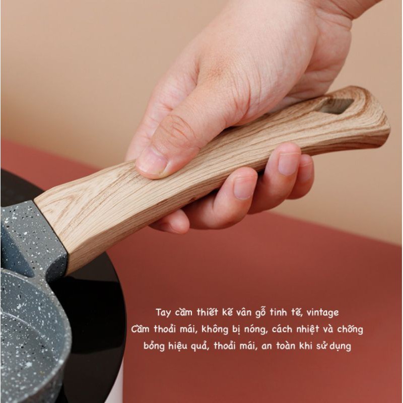 - Cán chảo sử dụng nhựa tổng hợp/cán gỗ cao cấp có thể chịu được nhiệt độ 180 độ C, không cháy và cách nhiệt 100%. Bạn có thể xào nấu cả ngày mà không lo bị bỏng tay.