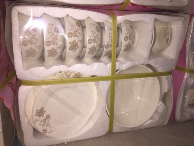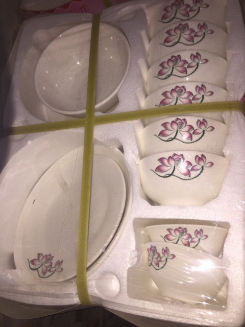 Bộ đồ ăn gồm 6 chén, 2 bát tô, 2 đĩa 2 cỡ, 1 bát mắm, 1 đĩa muốiHàng Bát Tràng sản xuất