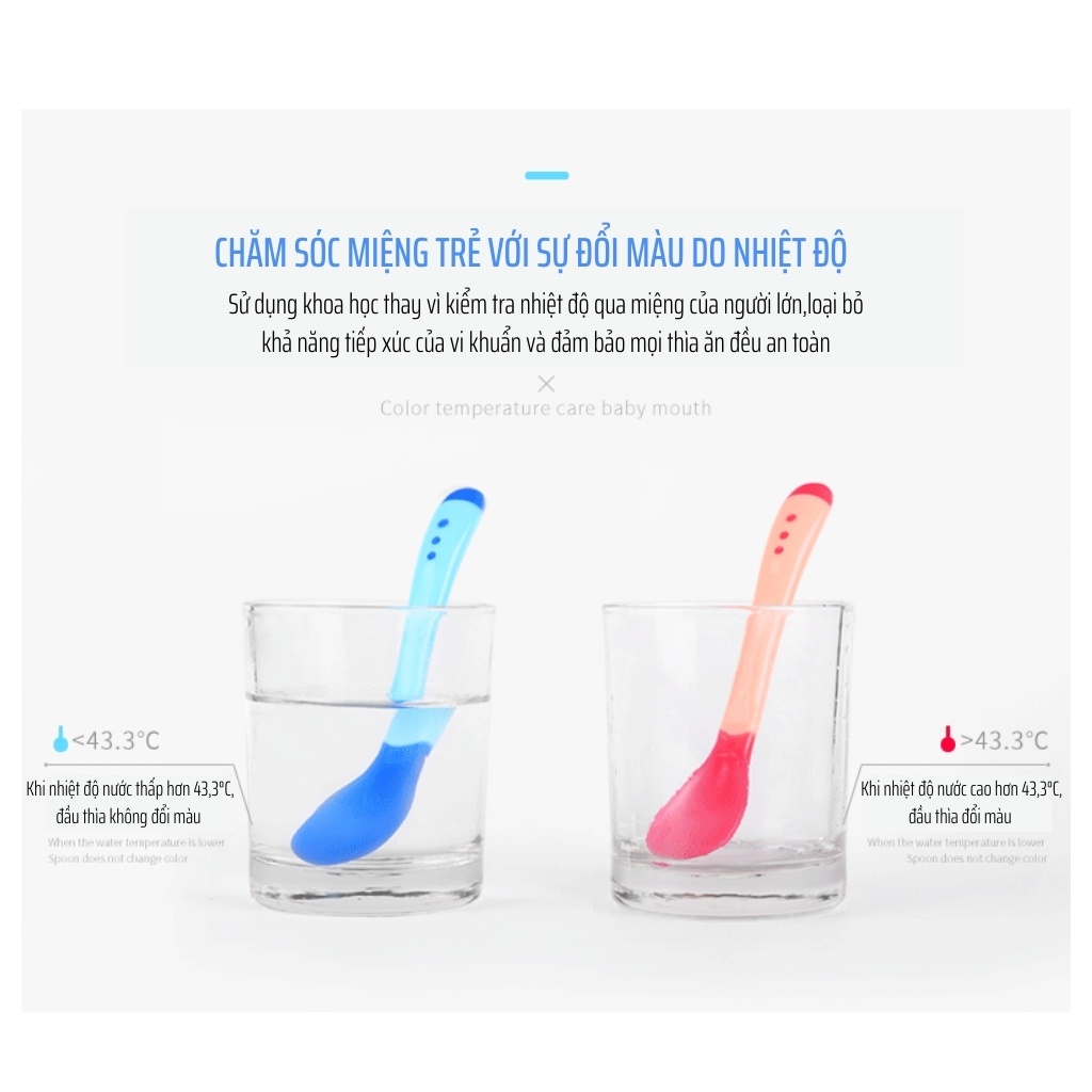 ✔️Thìa được thiết kế phần đầu làm bằng nhựa dẻo đàn hồi, mềm mại an toàn với nướu của con. Điều đặc biệt của sản phẩm này là được làm bằng chất liệu nhạy cảm với nhiệt độ. Nhiệt độ thích hợp cho viêc ăn uống của bé nên từ 38-40 độ nên khi nhiệt độ của đồ ăn đạt 40 độ phần đầu thìa sẽ chuyển sang màu trắng, khi nhiệt độ giảm xuống 38 độ màu ban đầu của thìa được phục hổi.