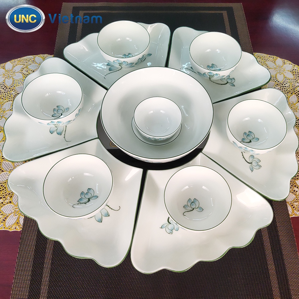 Bộ Đồ Ăn Hoa Mặt Trời UNC VIỆT NAM - Men kem cao cấp, hoa sen vẽ tay thủ công hoàn toàn, đủ món, chất liệu gốm sứ