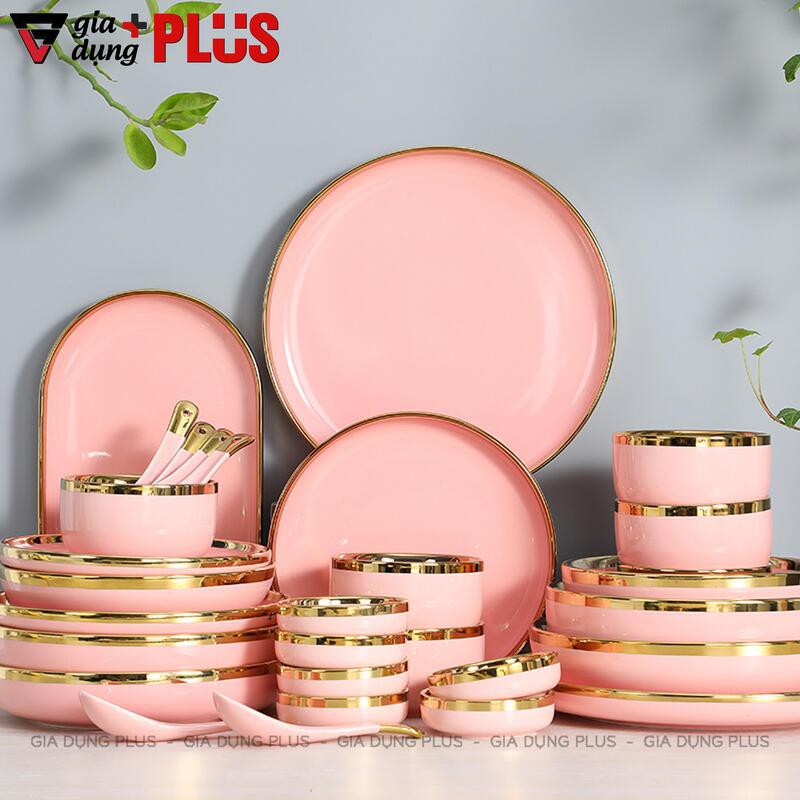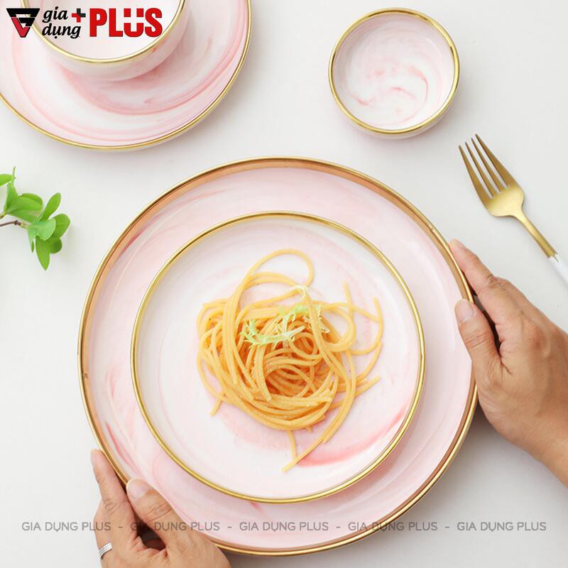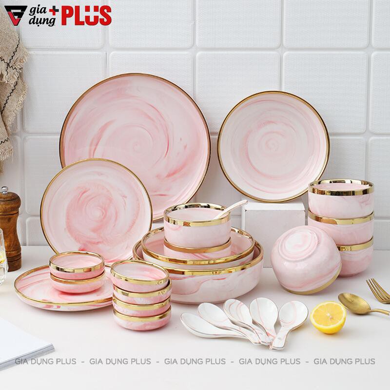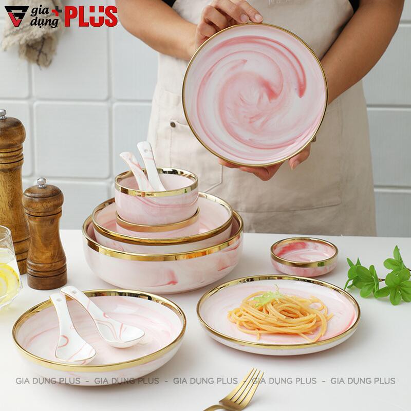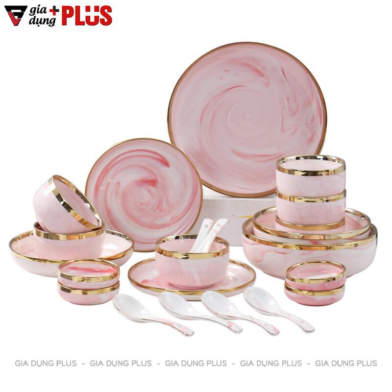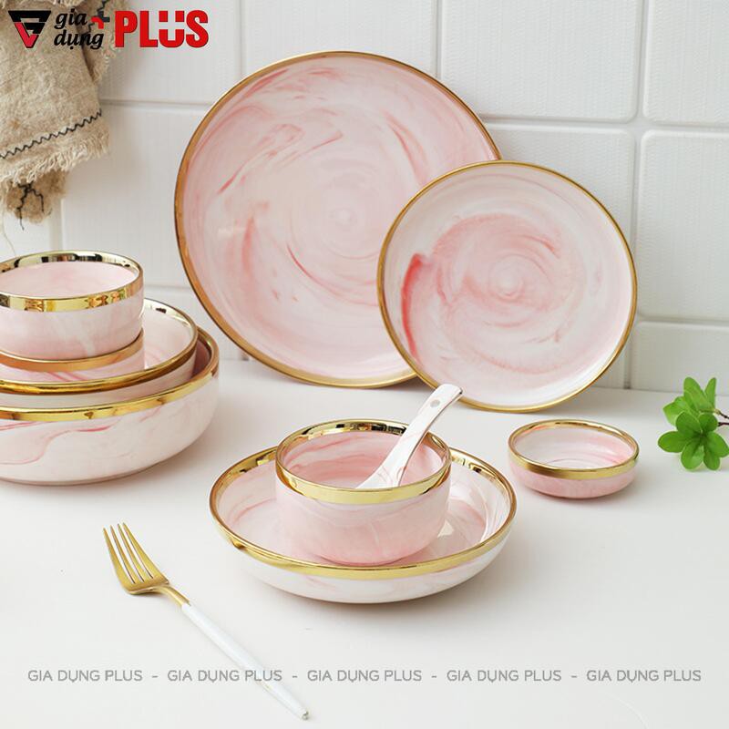 Nhà cửa & Đời sống > Bộ đồ bàn ăn > Tô || Bộ đồ ăn kèm hộp quà màu hồng vân đá cao cấp, viền vàng phong cách Bắc ÂuCòn hàng