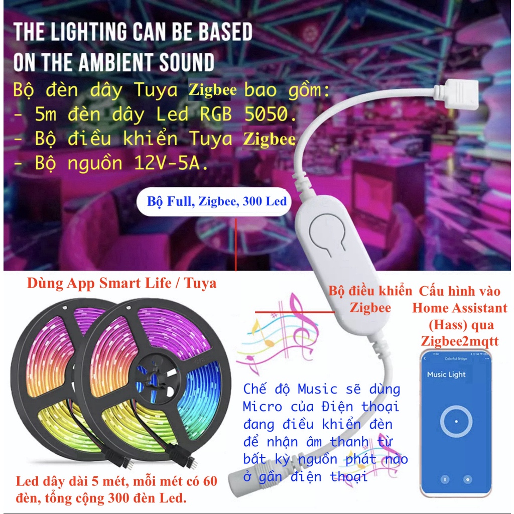 Bộ đèn Led dây 5M RGB 5050, Hệ Tuya, kết nối WIFI hoặc ZIGBEE tuỳ lựa chọn như bên dưới.Bộ đầy đủ Zigbee, 300 Led 5m, bao gổm: