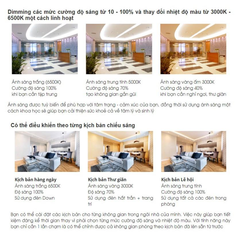 Dimming các mức cường độ sáng từ 10 - 100% và thay đổi nhiệt độ màu từ 3000K - 6500K một cách linh hoạt