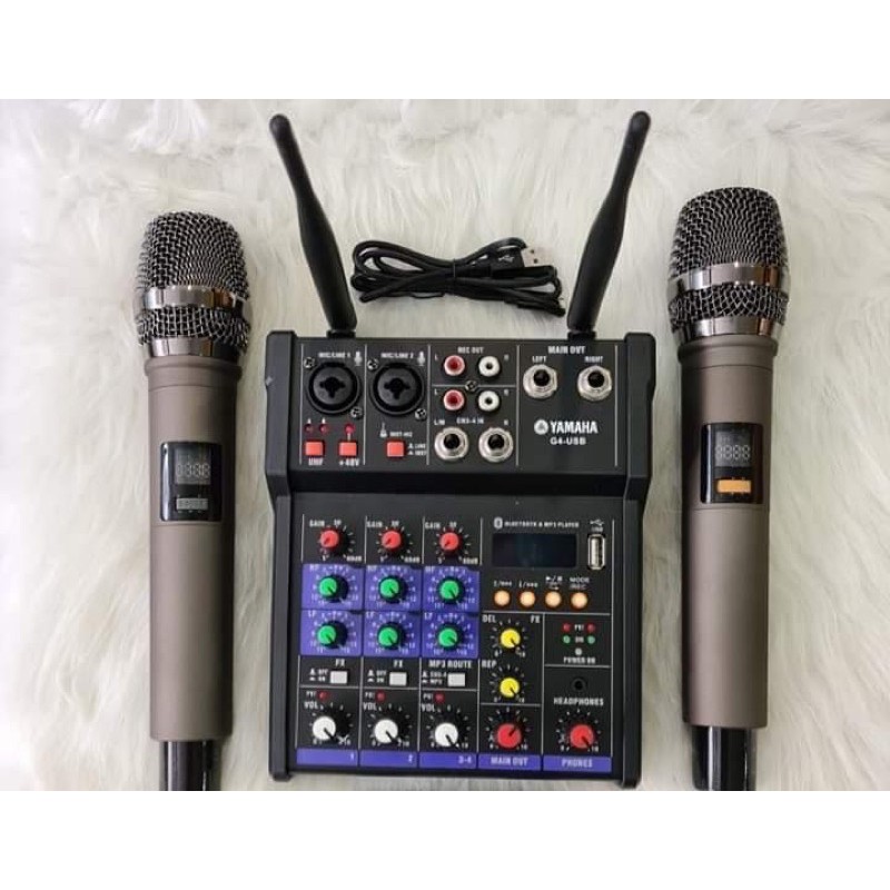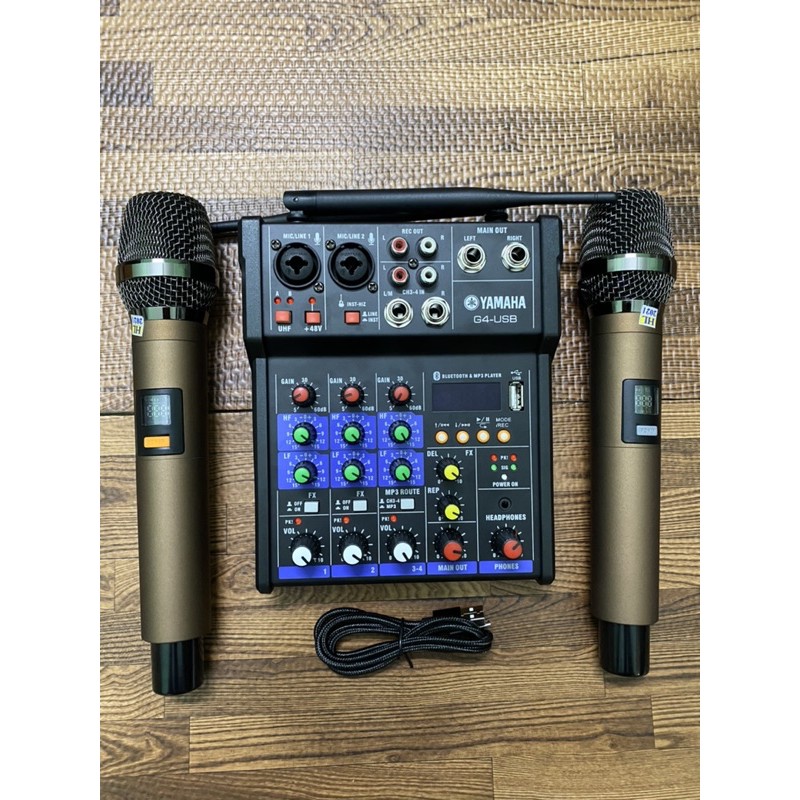 – Ưu điểm thứ 2 là Mixer Yamaha G4 tích hợp đầu thu không dây lại kèm theo 2 tay micro không chất lượng tốt sử dụng hát livestream âm thanh khá hay và đôi khi muốn đấu loa kéo hay amply gia đình để hát to ra ngoài đều khá hay ( chủ yếu dùng để livestream nhé các bác đấu ra loa ngoài sẽ không hay bằng livestream )