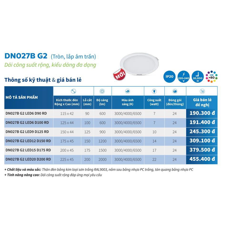 Bộ đèn PHILIPS LED Âm trần DN027B G2 có dải công suất rộng, hiệu suất cao, tiết kiệm điệnDòng sản phẩm đèn downlight âm trần PHILIPS DN027B hướng đến các đối tượng người dùng với sự ưu tiên về hiệu năng cao nhưng giá cả lại vừa phải.