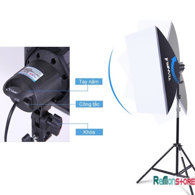 - Chuôi đèn Softbox TIANRUI được làm thành cụm khối lớn và cài đặt giống softbox 4 bóng nên rất cứng cáp. Nút công tắc ngay trên chuôi dễ dàng điều khiển. Tay nắm trên chuôi giúp bạn cực dễ dàng điều chỉnh softbox gật gù lên xuống.