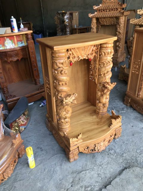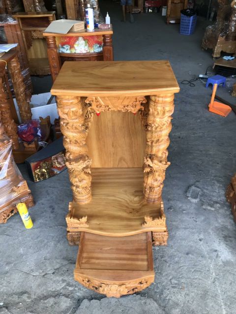 Bàn thờ thần tài ông địa gỗ gõ đỏ ngang 80 cm rồng cuộn cột 16 cm mẫu mới rất đẹpNgang 80 cm