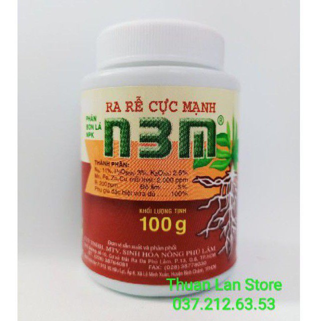 KÍCH THÍCH RA RỄ N3M - HŨ 100GSản phẩm kích thích ra rễ cực mạnh N3M được sản xuất bởi công ty TNHH MTV Sinh Hóa Nông Phú Lâm. Sản phẩm được rất nhiều người ưa chuộng sử dụng vì giá thành rẻ, công dụng kích thích ra rễ được dùng trên nhiều loại cây trồng từ rau, cây ăn quả cho đến các loại hồng hồng – hoa kiểng.