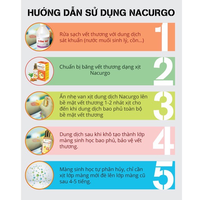 * Lưu ý: Dung dịch Nacurgo có tính sát khuẩn nên sẽ hơi xót khi xịt vào vết thương. Để tránh tình trạng xót