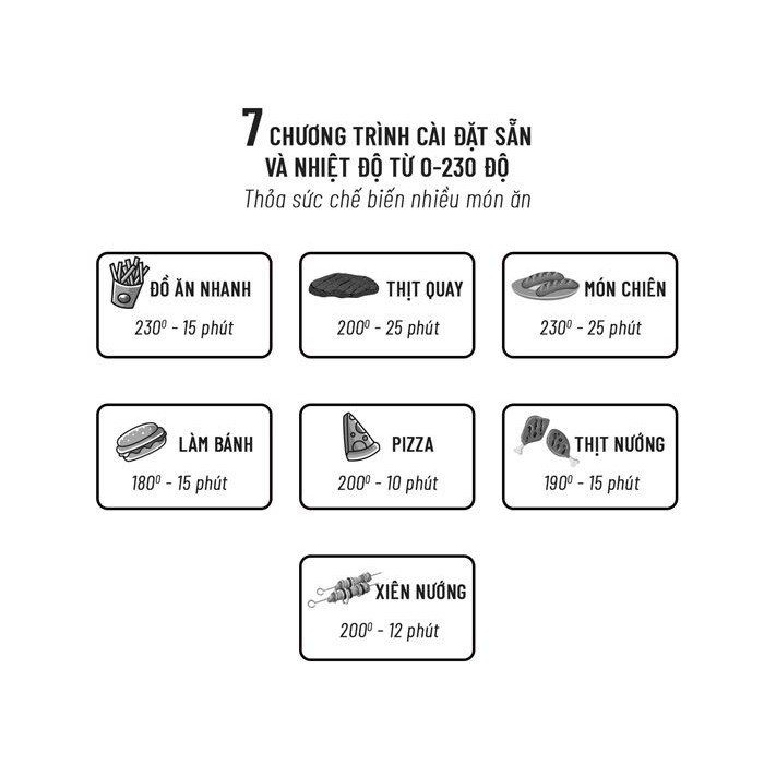 Khi sử dụng nồi chiên người dùng có thể điều chỉnh nhiệt độ linh hoạt từ 0 - 230 giúp chế biến đa dạng thực phẩm như gà nguyên con, cánh gà, bắp rang, thịt, cá, tôm, bò,... và đảm bảo món ăn chín đều, thơm ngon.