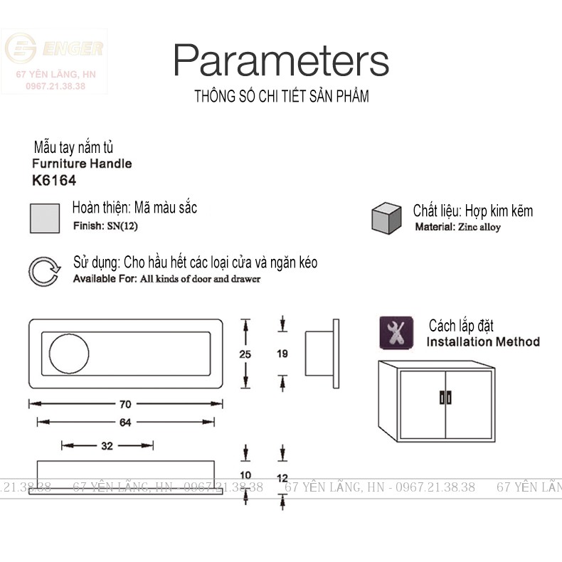 Kích thước (khoảng cách 2 lỗ vít): Tay âm.