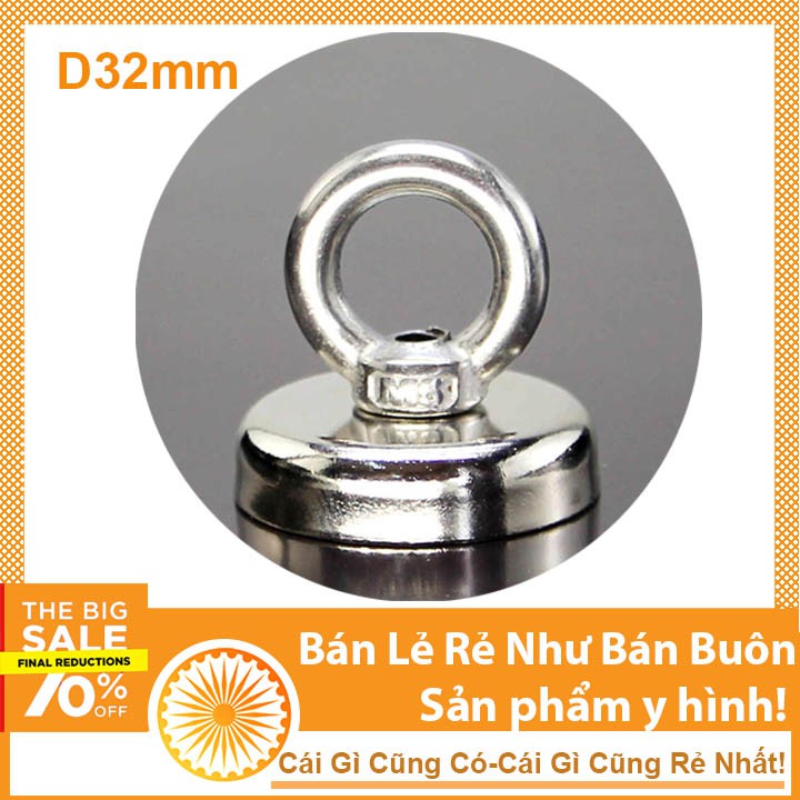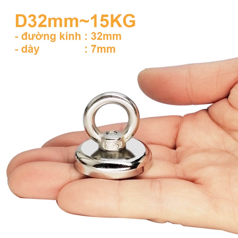 - Nam châm móc treo D32mm lực hút siêu khỏe 15kg dùng để trục vớt các món đồ bằng kim loại rơi xuống sông, tìm kiếm các vật bằng kim loại dưới nước. Treo các đồ vật lên trên cột bằng sắt như cây chậu, móc treo quần áo. Hút đinh rớt trên đường ....