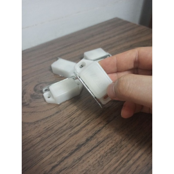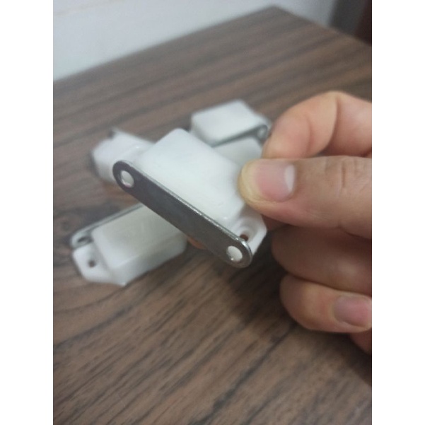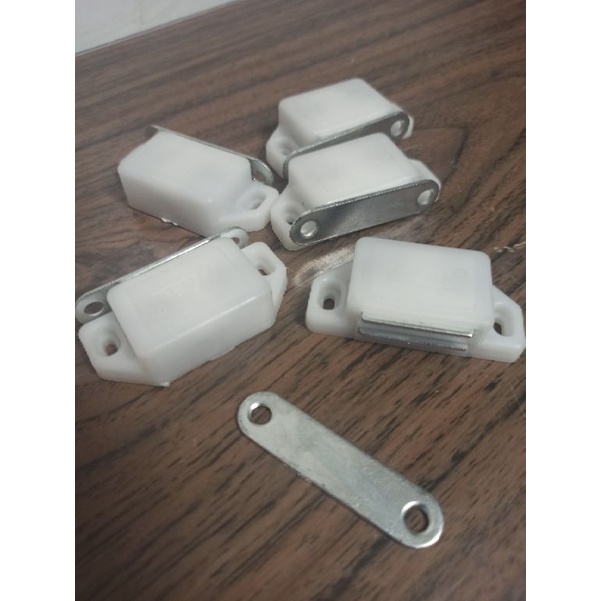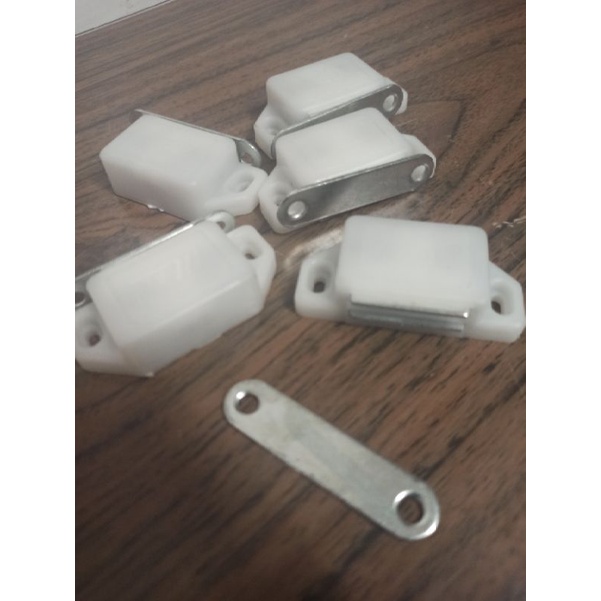 - Gồm 2 miếng có lỗ để bắt vít cố định, miếng sắt mỏng để gắn lên cánh cửa, miếng nam châm được vít cố định lên tủ.