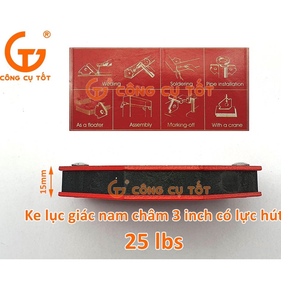 Trong quá trình thi công hàn sắt hoặc dựng khung kim loại, người thợ gặp khá nhiều khó khăn khi tạo dựng các góc. Có thể kể tới các tình huống phải đo góc bằng thước đo sau đó dùng Ê tô để cố định. Nếu không có Ê tô bạn sẽ phải tự mình giữ vật liệu hoặc nhờ tới sự trợ giúp của người khác. Tuy nhiên cách này dễ gây bỏng tay, không đảm bảo an toàn lao động mà độ chính xác của góc lại không cao, đặc biệt với những góc vuông thì sai số càng lớn.Ke góc lục giác nam châm 3 inch với lực hút 25LBS có khả năng giữ hút khối lượng. Ke nam châm có khả năng định hình chính xác các góc: 30°, 45°, 60°, 75°, 90°, 105°. Đây là dụng cụ không thể thiếu của những người thợ hàn, ứng dụng trong sản xuất cơ khí, hàn các góc của vì, kèo nhà, khung sắt, khung cửa, tay cầu thang sắt, bàn ghế sĐảm bảo góc được dựng với độ chính xác cao