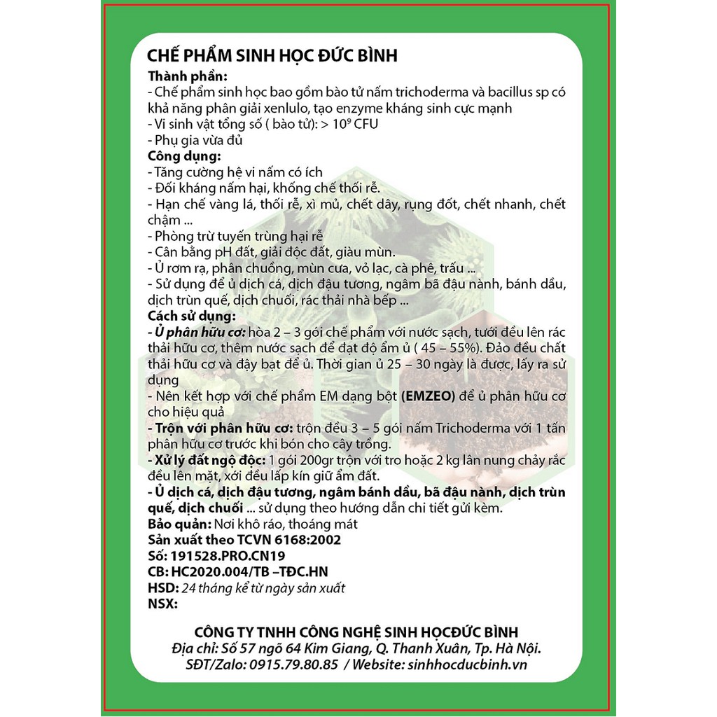 NẤM ĐỐI KHÁNG TRICHODERMA BACILLUS ( Chuyên dùng để ủ phân hữu cơ và kiểm soát nấm bệnh)