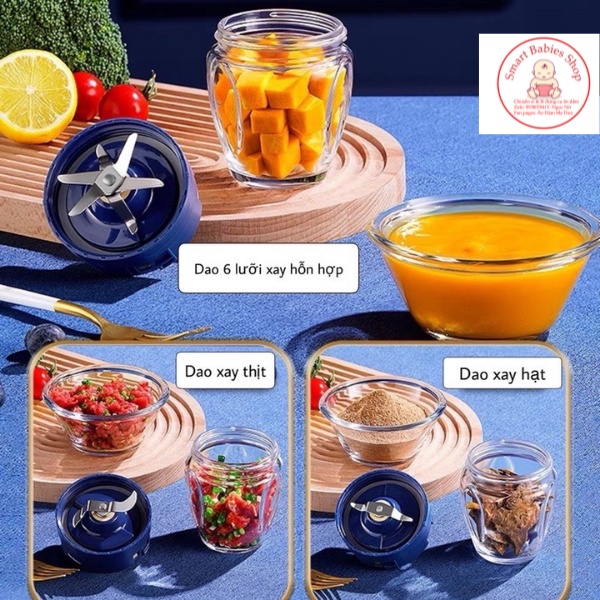 - Có 3 cối xay thuỷ tinh và 3 dao inox, mỗi dao có 4 lưỡi sắc bén giúp xay nhuyễn thực phẩm.