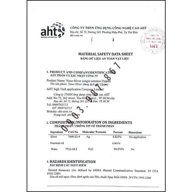 Nano bạc tạo khói, diệt khuẩn khử mùi AHT chai 1 Lít- Hương Tinh QuếSản phẩm Nano bạc AHT an toàn cho con người và môi trường với kết quả được thẩm định bởi sở y tế TP HCM