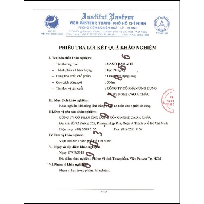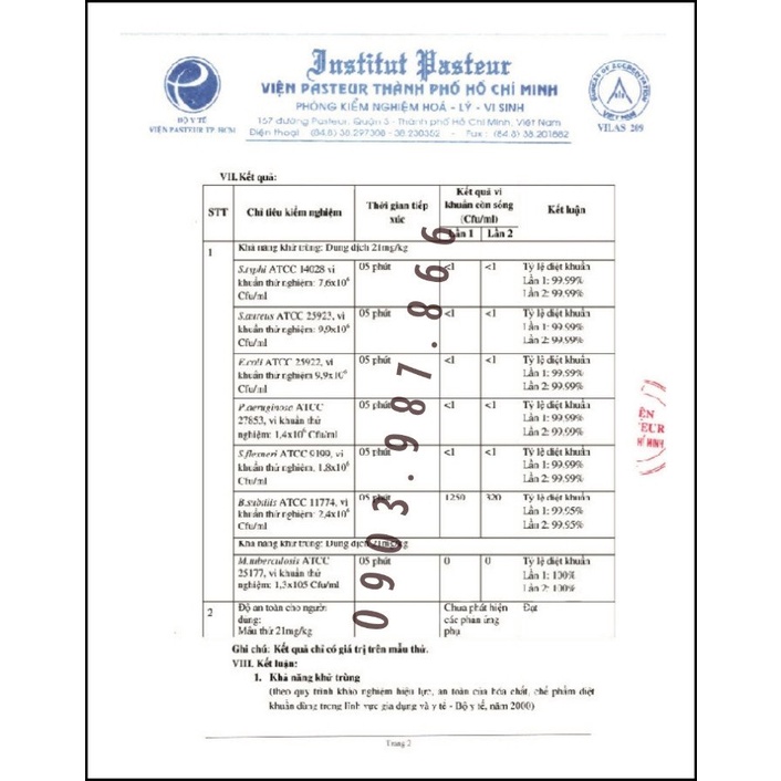Diệt sạch 99,99% vi khuẩn, nấm mốc gây bệnh được chứng nhận bởi Viện Paster, Sở Khoa Học và Công nghệ TP. HCM