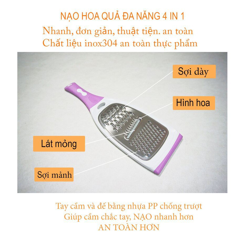 -Và sản phẩm nạo hoa quả có đến 4 chức năng cho chị em có thể thoải mái lựa chọn kiểu gọt , nạo , lát mỏng để trang trí cho bữa ăn thêm phần bắt mắt