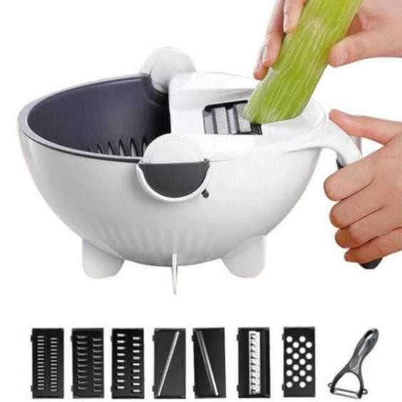 Bộ Dụng Cụ Thông Minh Nạo Rau - Củ - Quả Kèm Rổ 9 Trong 1 Đa Năng- Bộ Dụng Cụ Thông Minh Nạo Rau - Củ - Quả Kèm Rổ 9 Trong 1 Đa Năng thiết kế thông minh, nhỏ gọn và nhiều chức năng với cấu tạo gồm: lưỡi gọt (nạo) vỏ củ quả (củ khoai tây, bầu, bí, cà rốt, mướp, susu…); lưỡi bào (cắt) củ quả thành sợt nhỏ (Bào cà rốt, đu đủ, dừa…); rổ hứng rửa xoay 360 độ không lo bị rơi ra ngoài… giúp việc chế biến các món ăn thật đơn giản và dễ dàng và đẹp mắt.