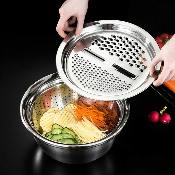Nhà cửa & Đời sống > Dụng cụ nhà bếp > Bàn nạo, dụng cụ bào, cắt || Bộ Nạo rau củ 3 món , Rổ bào rau củ kiêm Rổ và Chậu inox cao cấpCòn hàng
