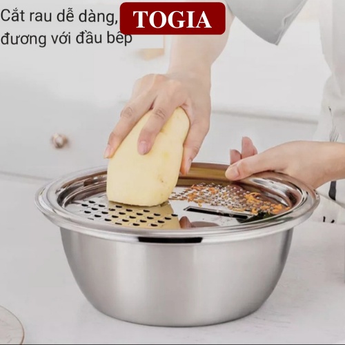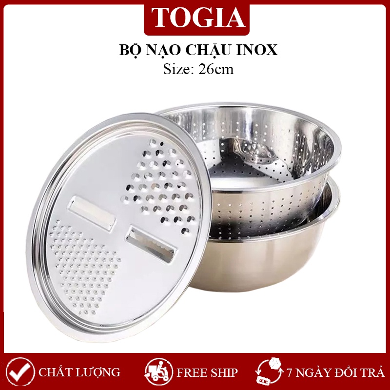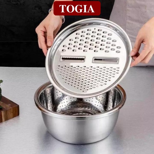 Nhà cửa & Đời sống > Dụng cụ nhà bếp > Bàn nạo, dụng cụ bào, cắt || Bộ Nạo Rau Củ 3in1 Bào Nạo Rau Củ Kiêm Rổ và Chậu Inox Cao cấp Đa Năng, Tiện Lợi Đường Kính 26cmCòn hàng