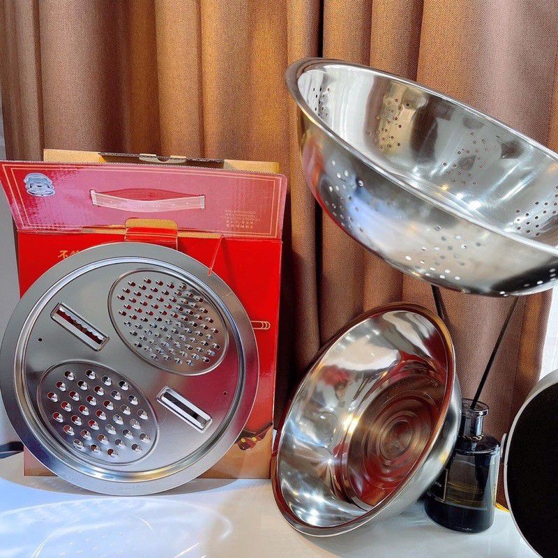 Bộ bao gồm : 01 Mặt nạo nhiều kiểu, 01 Rổ inox, 01 Chậu inox 100% cao cấp dày dặn