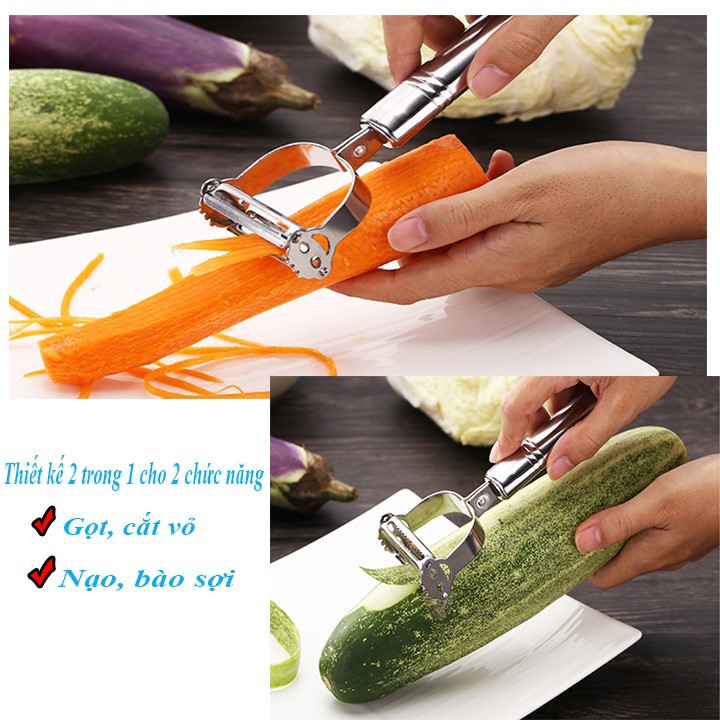 - Nạo Rau Củ Quả 2IN1 Bằng Inox Không Gỉ thiết kế 2 trong 1 cho hai chức năng, có thể là gọt vỏ hoặc dụng cụ bào sợi.