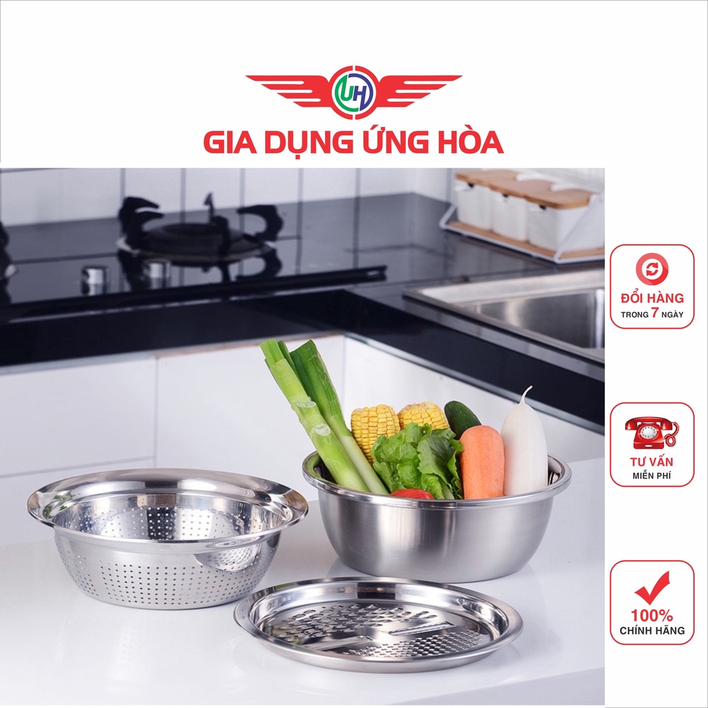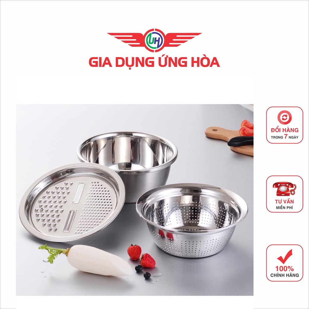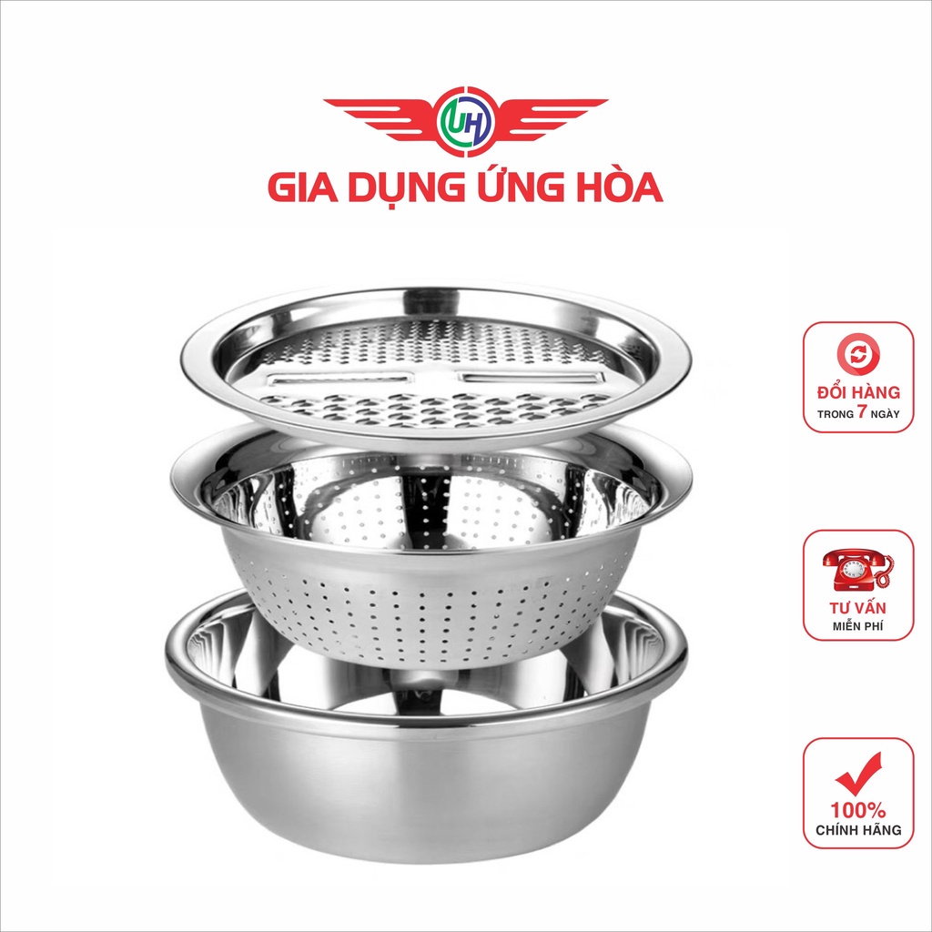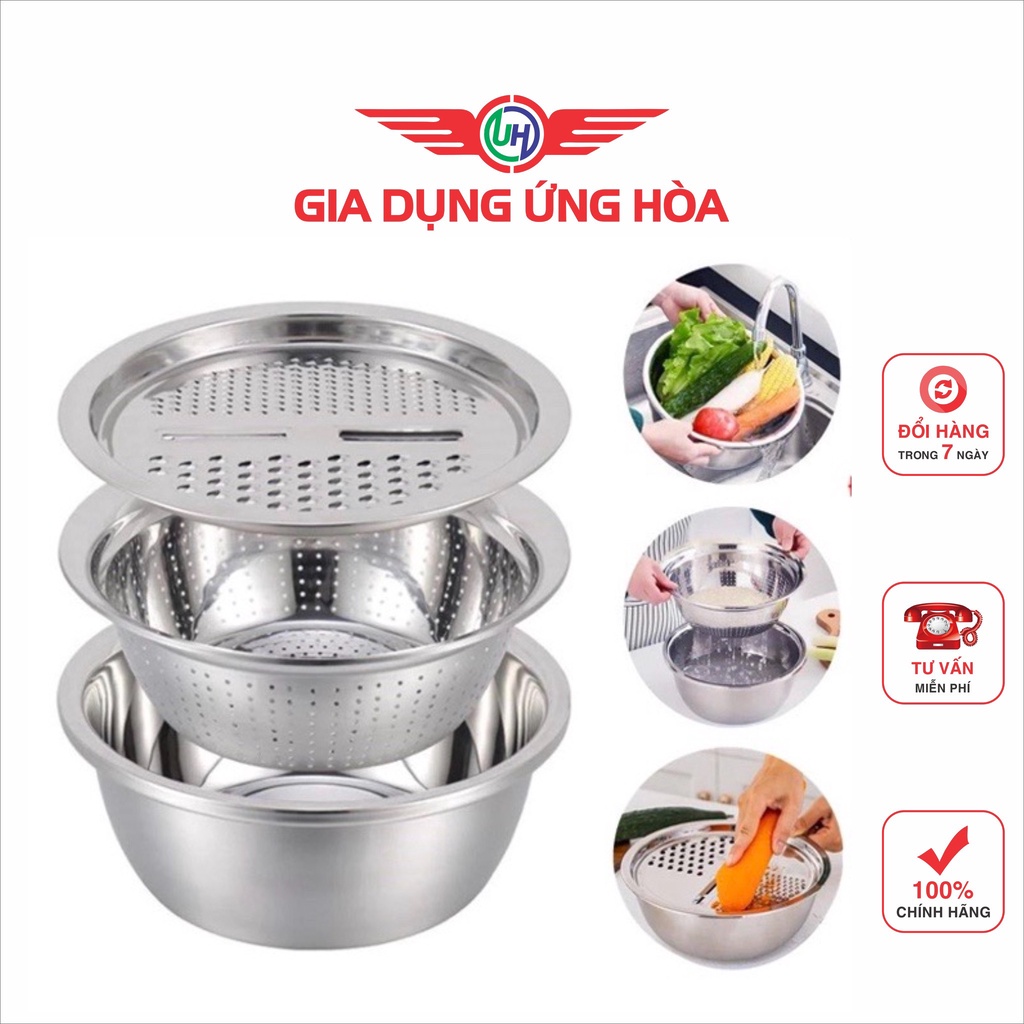 Bộ bao gồm : 01 Mặt nạo nhiều kiểu, 01 Rổ inox, 01 Chậu inox 100% cao cấp dày dặn