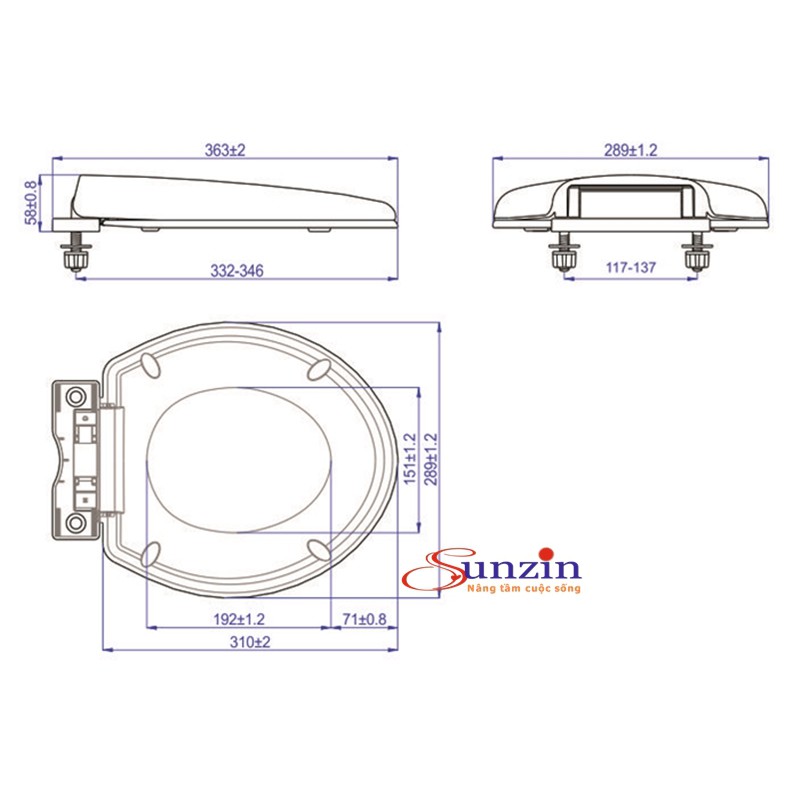 - Kích thước từ lỗ chốt đến mỏm ngoài cùng của bồn cầu: 33-35cm (có thể điều chỉnh bằng cách xoay ốc chốt)