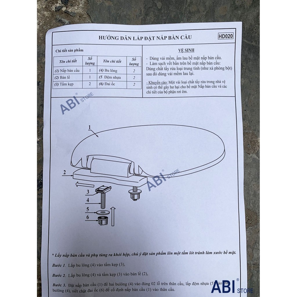 Hướng dẫn lắp đặt: Lắp bu lông vào tấm kẹp, lắp vào bản lề, đặt nắp bàn cầu để 2 bu lông vào đúng 2 lỗ trên thân cầu, lắp đệm nhựa vào thân bu lông, siết chặt đai ốc để cố định nắp bàn cầu vào thân cầu. chi tiết có trong tờ hướng dẫn lắp đặt đi theo hộp.