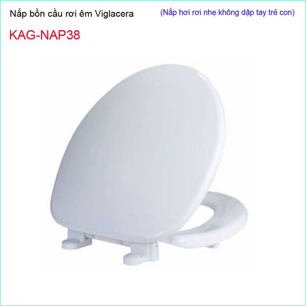 Nắp bồn cầu rơi êm Viglacera, nắp đậy bàn cầu KAG-NAP38Kích thước nắp: dài 44cmx rộng 37cm ( +- 1cm) khoảng cách giữa 2 lỗ chốt: 130 - 150cm