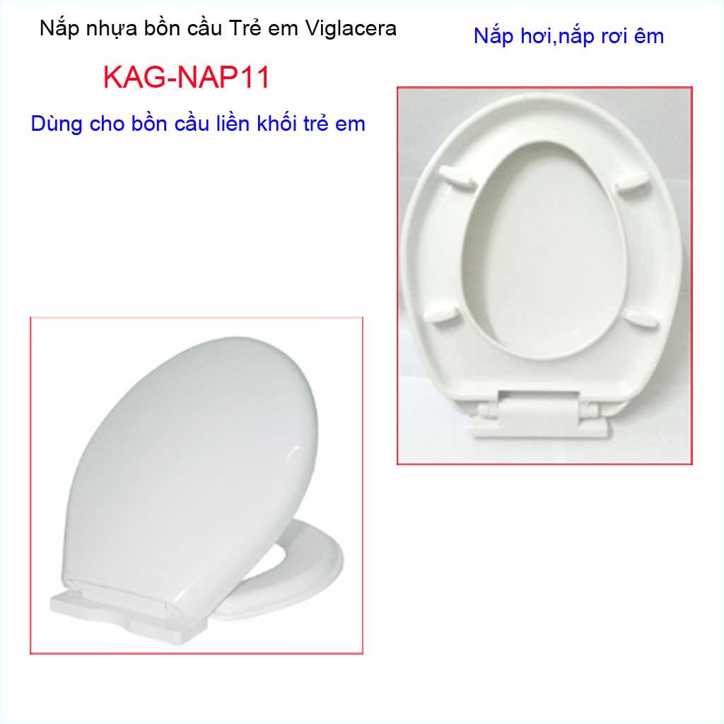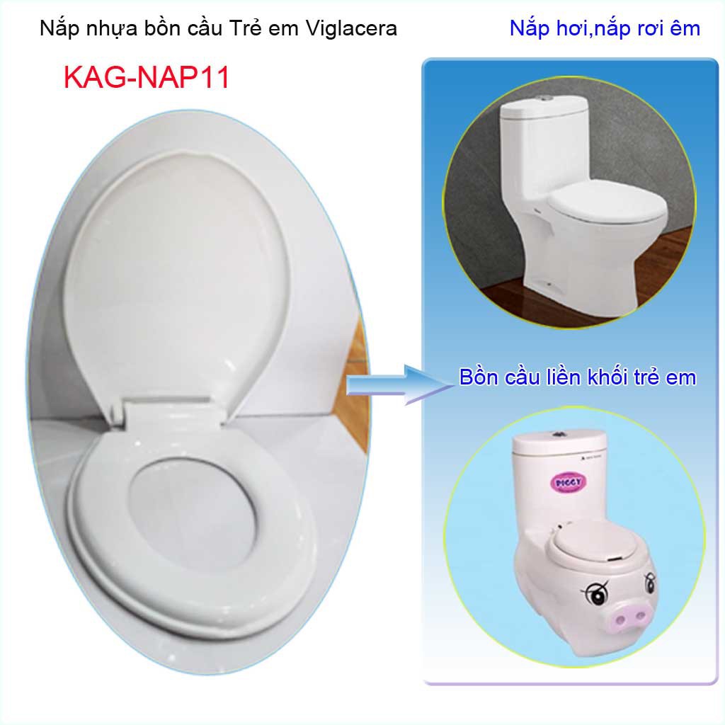 Nắp bồn cầu trẻ em rơi êm, nắp đậy bồn cầu Viglacera chotrường mẫu giáo KAG-NAP11 có thể thay thế cho bệt két liền trẻ em Viglacera BTE, bồn cầu 1 khối trong nhà trẻ, trường mẫu giáo các hãng như : Bồn cầu trẻ em Thiên Thanh Piggy, Bồn cầu trẻ em Caesar C1352, Bồn cầu trẻ em Cotto, ...
