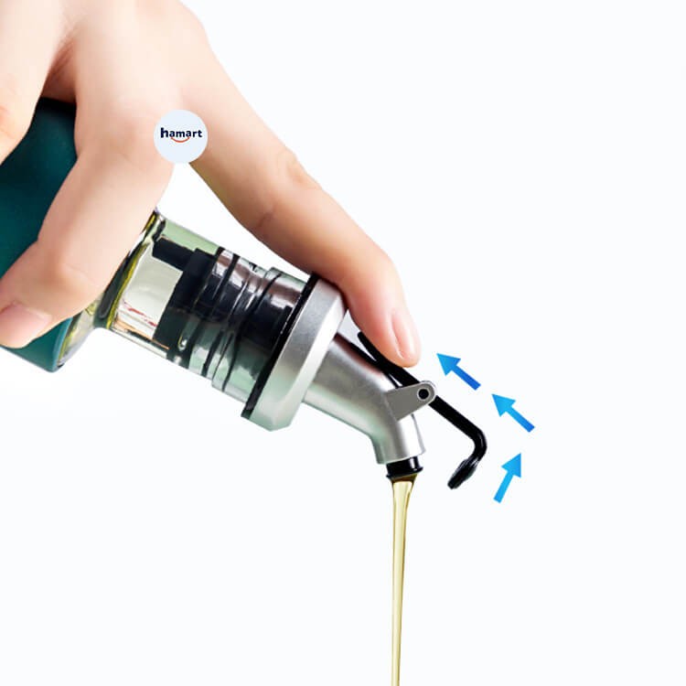 - Chỉ một động tác ấn vào đuôi nắp chai là chai tự động mở. Ngoài ra, vòi chai khá nhỏ nên khi bạn đổ chất lỏng ra có thể lấy tương đối chính xác lượng dầu ăn cần sử dụng, tránh lãng phí & dầu sẽ không bị trào ra xung quanh miệng sau khi rót