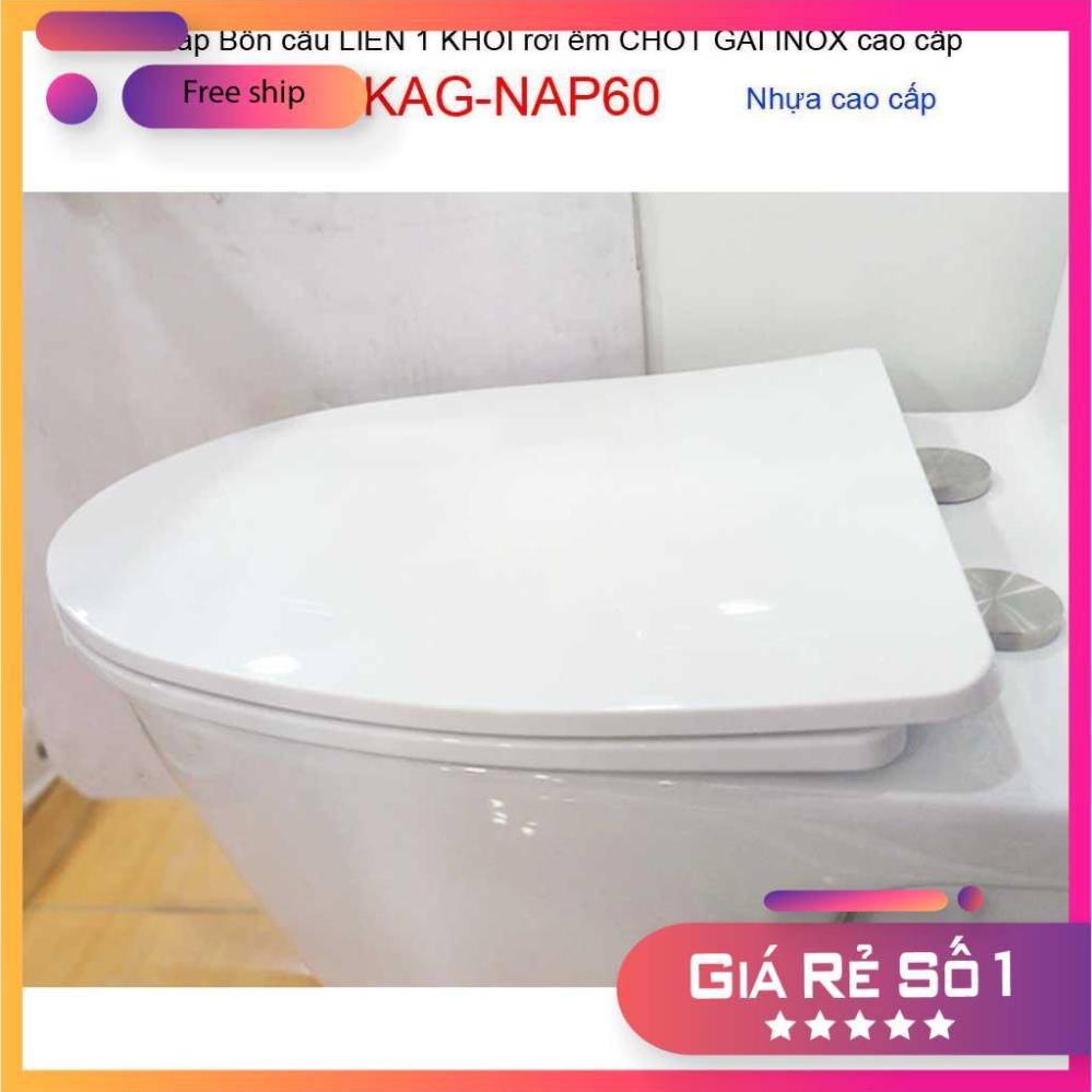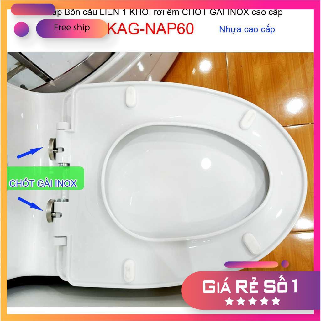 Nắp đậy bồn cầu 1 khối rơi êm chốt gài Inox , nắp bồn cầu khối KAG-NAP60 có thể thay thế cho bệt liền khối Trung Quốc, bồn cầu 1 khối các mã số sau: Bàn cầu 1 khối Viglacera ( mã số V45, V35, V37, V38, V41, BL5, C109); bàn cầu liền khối Inax ( mã số AC-4005VN;AC2700VN, AC1135VN; AC1035VN, C918, C909, C991, C939, C1017, C1008...); Bàn cầu 1 khối Caesar ( mã số C1353, CCD1356, CD1364, CD1374, CD1375, C1345, CD1348, CD1349) bàn cầu liền khối American khối: VF2011, VF2010, VF2530, VF2024..), Bàn cầu Toto (C945, C818,C884, MS636, MS668), ...