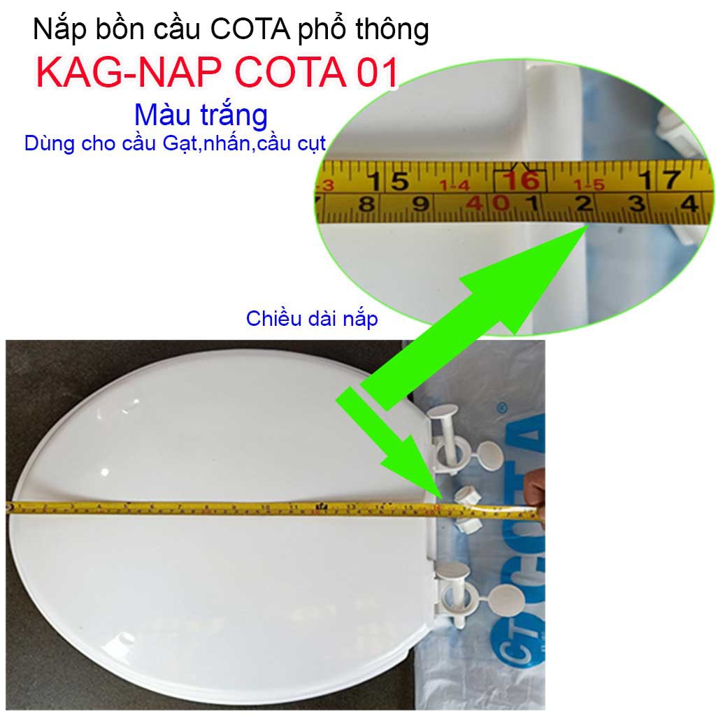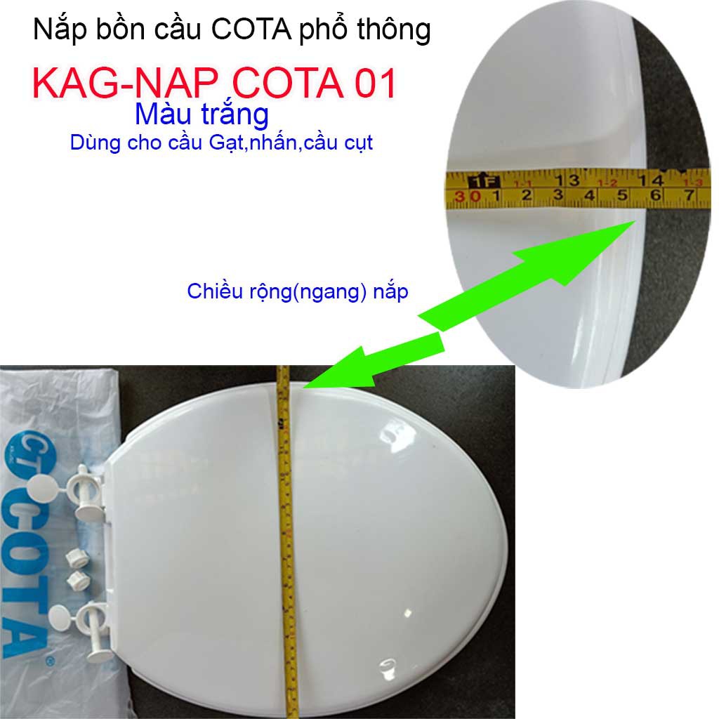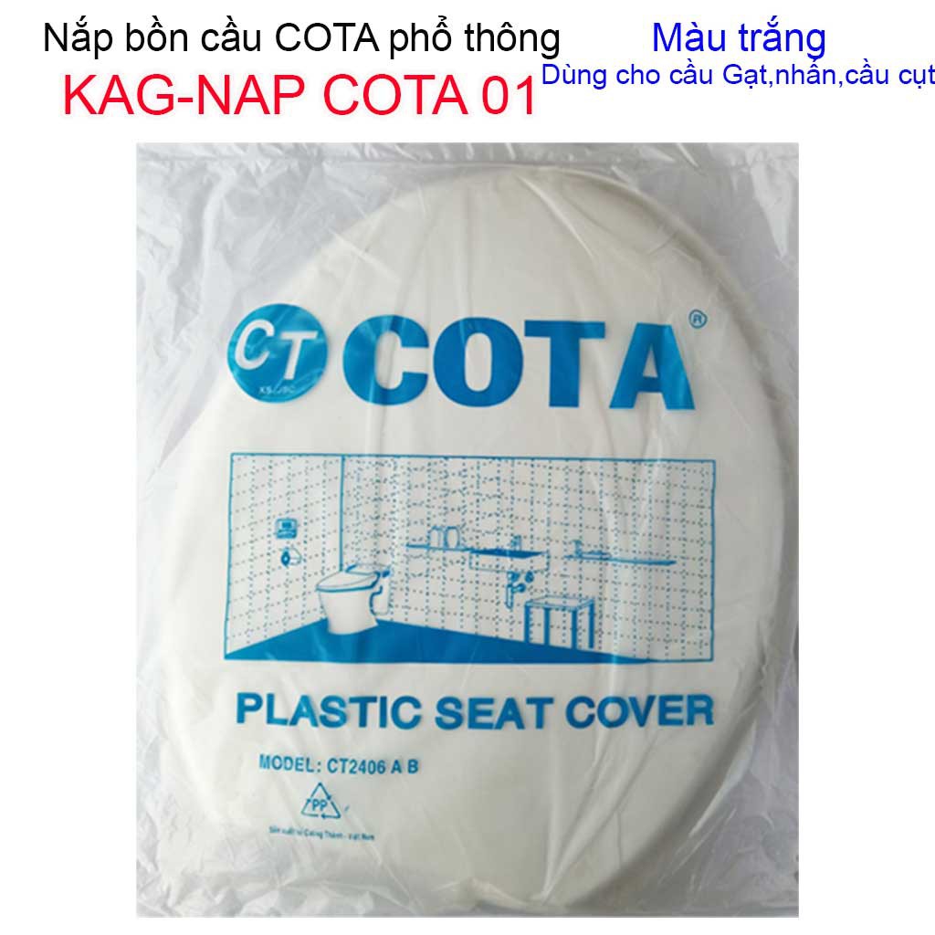 Nắp đậy bàn cầu Cota, Nắp bồn cầu phổ thông màu trắng giá sỉ KAG-NAP Cota01Chất liệu: Được làm từ nhựa ABS màu trắng, nhựa mỏng hơn so với nắp Thiên Thanh NAP22T
