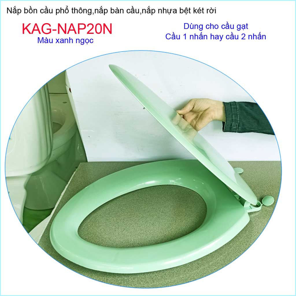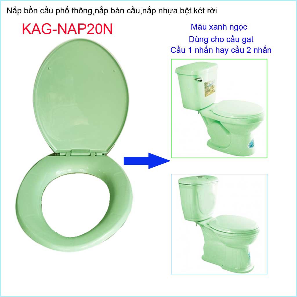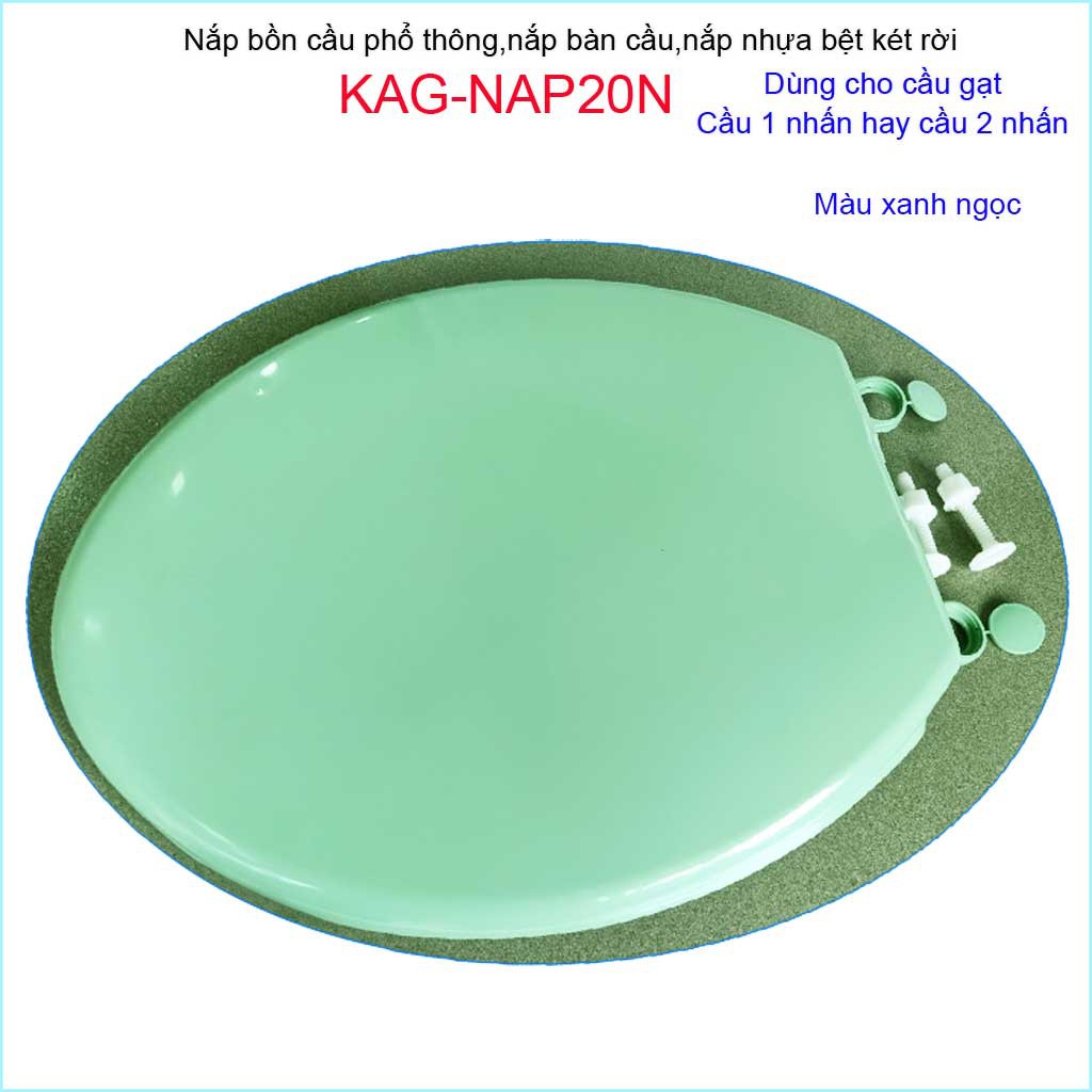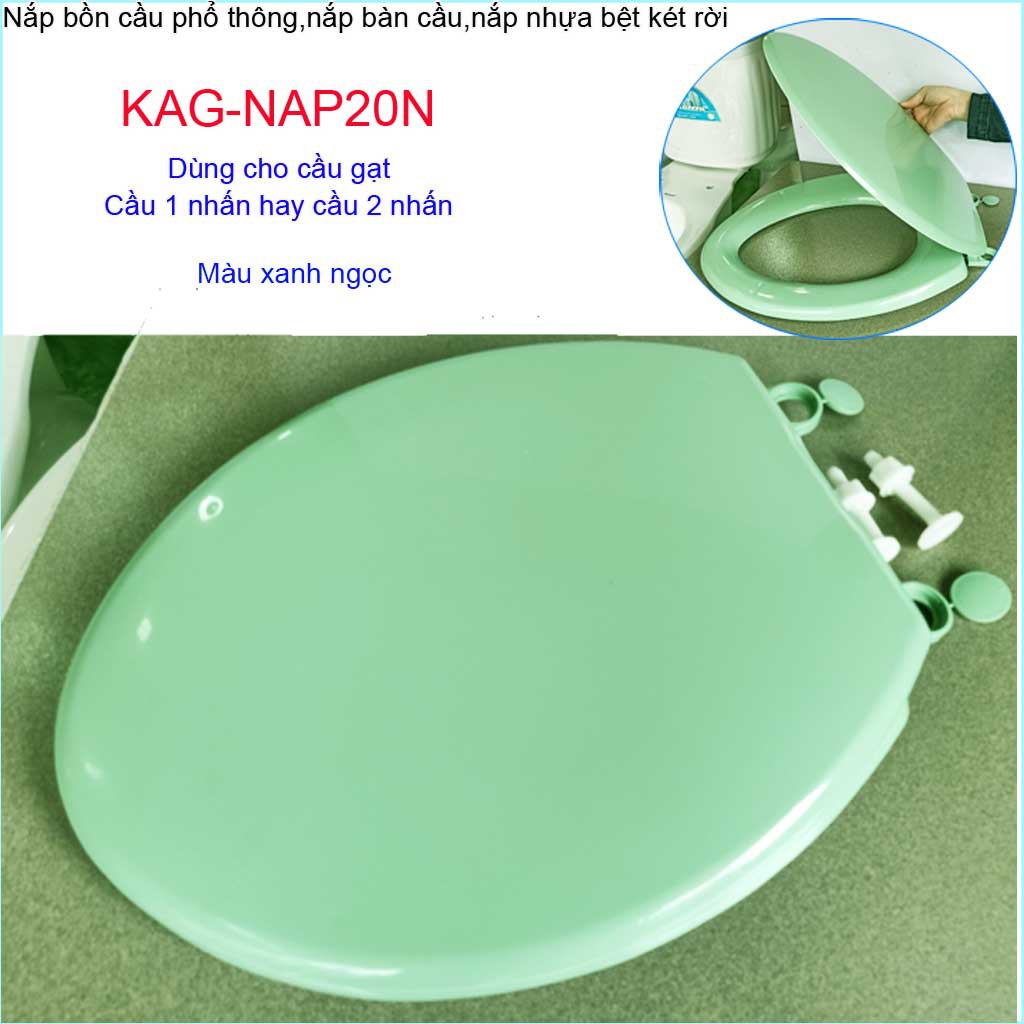 Nắp bàn cầu phổ thông KAG-NAP20N, nắp đậy bồn cầu 2 khối Xanh NgọcKích thước: chiều dài 42cm, chiều rộng 36cm, khoảng cách giữa 2 lỗ chốt: 130 - 150cm