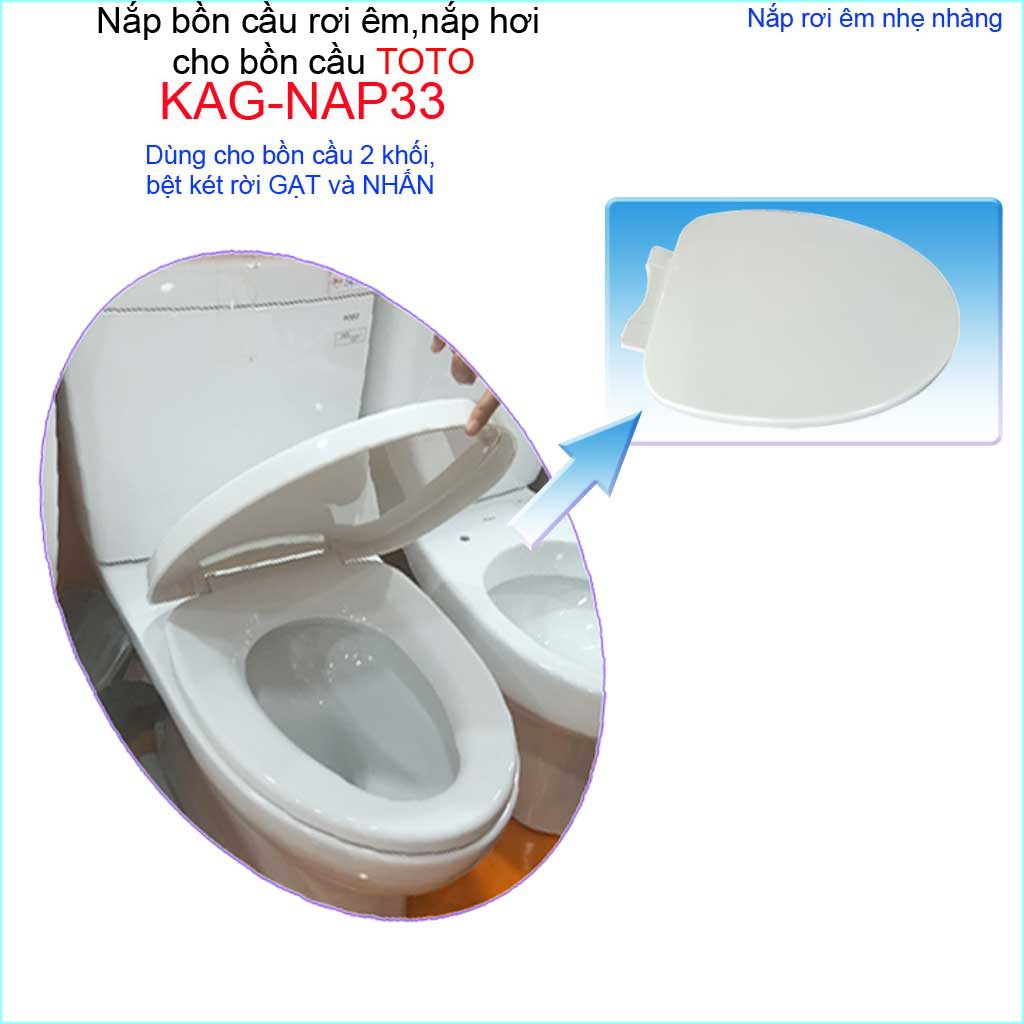 Nắp đậy bồn cầu rơi êm, nắp cho bàn cầu Toto, nắp bồn cầu 2 khối KAG-NAP33Kích thước nắp: dài 49 cmx rộng 37cm ( +- 1cm) khoảng cách giữa 2 lỗ chốt: 13 - 16cm