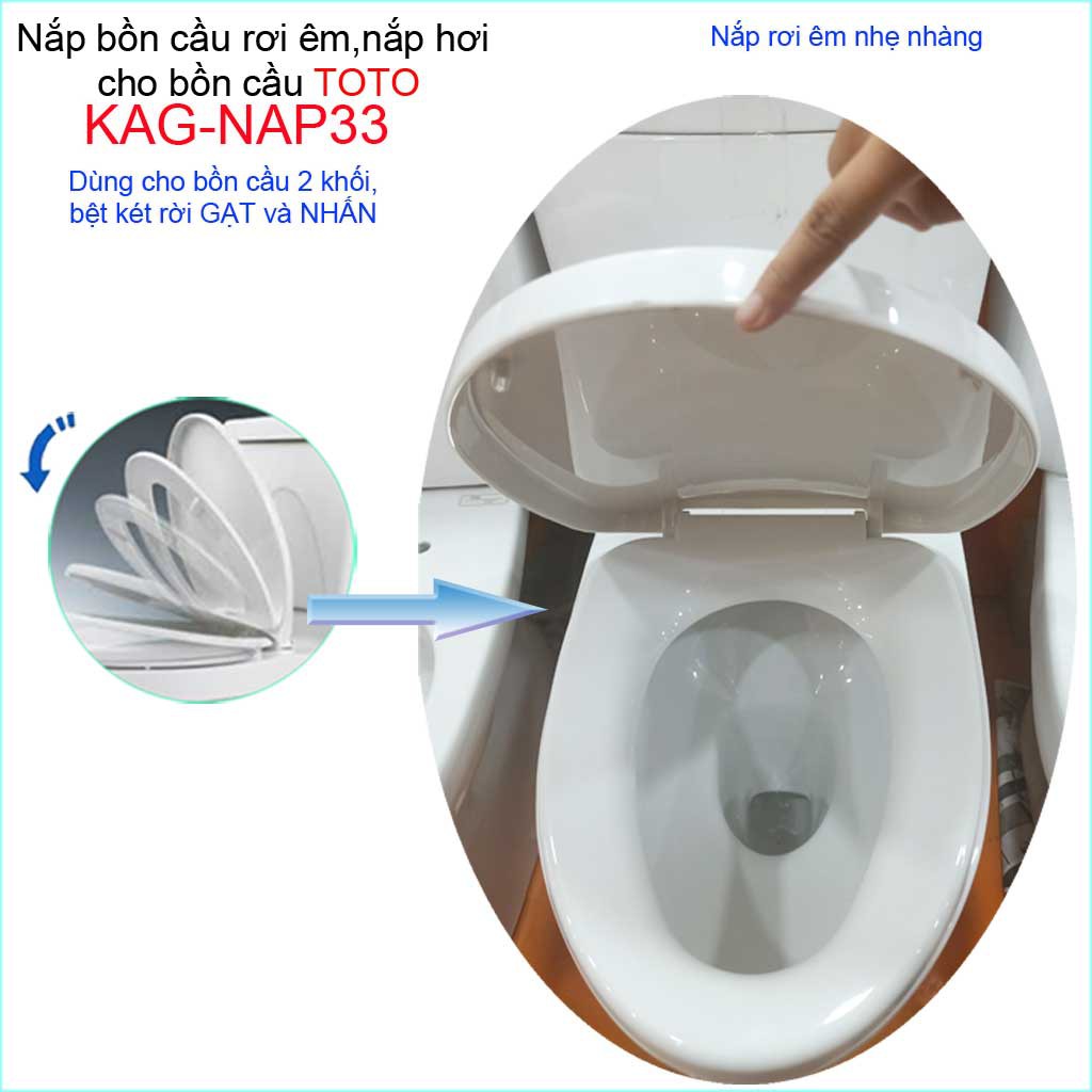 Ưu điểm: Nắp KAG-NAP33 rơi êm ( khi đậy nắp không có tiếng kêu, nắp từ từ rơi xuống), dùng tốt cho gia đình có trẻ nhỏ, không sợ trẻ kẹt tay khi nắp rơi xuống