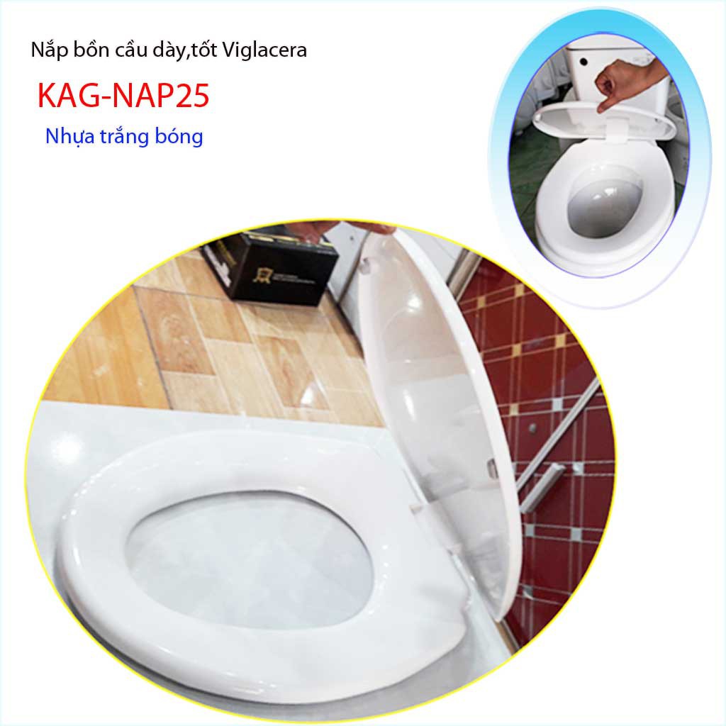 Nắp đậy bồn cầu Viglacera, nắp bàn cầu KAG-NAP25 được làm từ nhựa ABS màu trắng có độ đàn hồi cao,dày gấp 2 lần nắp phổ thông, khó bể vỡ, khó ngả màu trong quá trình sử dụng.