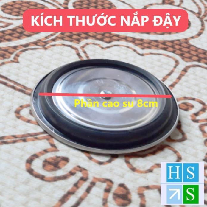 Kích thước: Đường kính 8cm (Phần cao su) và 9 cm (Phần nắp inox) . Dầy 1cm