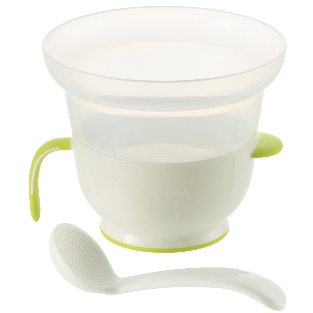 Cốc nấu cơm nát: gồm cốc và nắp thông hơi được làm bằng chất liệu nhựa Polypropyle (P.P) cao cấp, không chứa BPA độc hại. Cốc chịu nhiệt dùng để nấu trong nồi lò vi sóng đồng thời có thể dùng làm bát cho bé ăn dặm. Thìa vừa dùng để đong cơm và dùng để nghiền thức ăn cho bé.