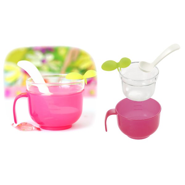 - Cốc đựng bằng nhựa, có tay cầm, có vạch chia ml để đong nước, đáy cốc có các hạt sần để nghiền cơm nát dễ dàng. Cốc nhựa có thể dùng để đựng cốc thủy tinh khi còn nóng hoặc để đựng cháo trực tiếp cho bé ăn.