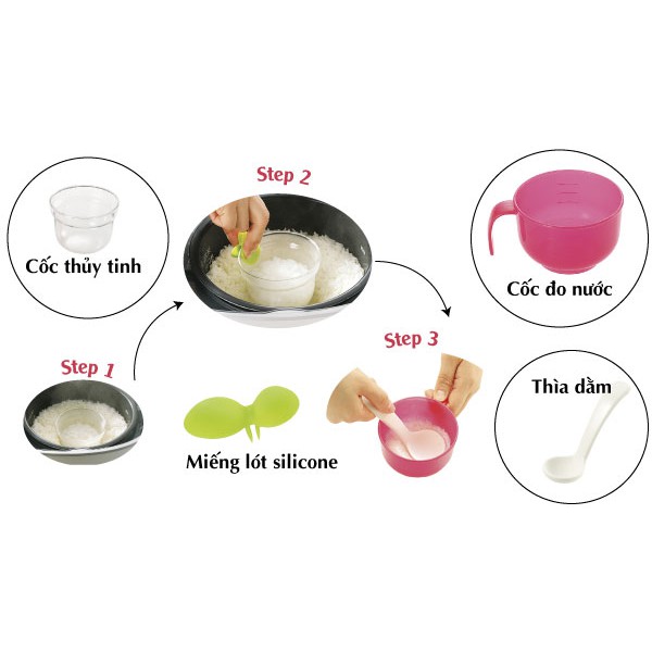 Đổ gạo và một lượng nước tương ứng vào cốc nấu (mẹ có thể vo gạo và đo nước ngay trong cốc nhựa sau đó đổ cả nước cả gạo vào cốc nấu). Sau đó cho cốc nấu vào giữa nồi cơm điện của gia đình, lưu ý là gạo trong cốc phải ở dưới mức nước có sẵn trong nồi cơm của gia đình và không được đậy nắp.