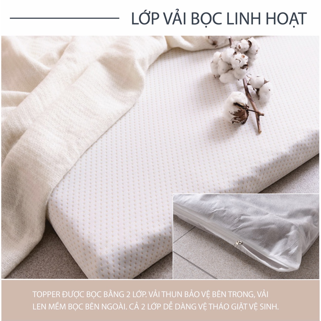 ✔ Topper Comfy sử dụng 2 lớp vỏ bọc bên ngoài Foam Cushion. Lớp bên trong là chất vải thun mềm mại, lớp bọc ngoài cùng, nơi có thể tiếp xúc trực tiếp với da là chất vải len 3 lớp dày dặn, mềm mịn hơn, dễ dàng co giãn để định hình đường cong cơ thể một cách nhanh chống, đáp ứng vai trò hỗ trợ phân tán lực nhanh và thoải mái nhất. Đây là chất liệu thân thiện môi trường, thấm hút mồ hôi, không gây dị ứng da. Lớp vỏ bọc Topper có thể tháo giặt dễ dàng.