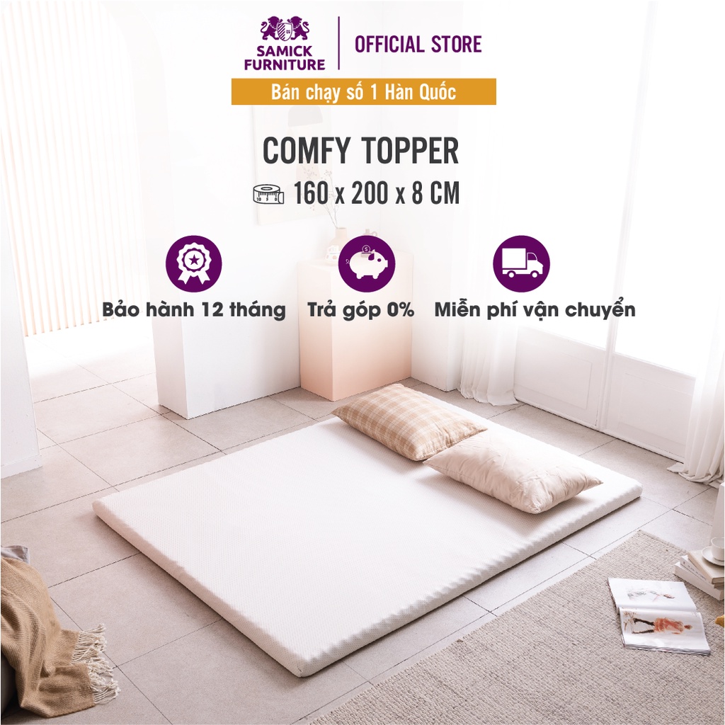 5 LÝ DO ĐẶC BIỆT ĐỂ CHỌN NỆM TOPPER TĂNG TIỆN NGHI SAMICK COMFY✔ Nệm Comfy Topper Samick được nghiên cứu chuyên sâu, được phát triển chuyên biệt để hỗ trợ nâng đỡ tối đa trọng lượng cơ thể, giảm áp cho người nằm. Độ đặc của Cushion là 20kg/m3 tạo nên sự đàn hồi hoàn hảo cho một tấm Topper, cùng với độ dày 8cm, giúp mang lại cảm giác êm ái và thoải mái nhất có thể.