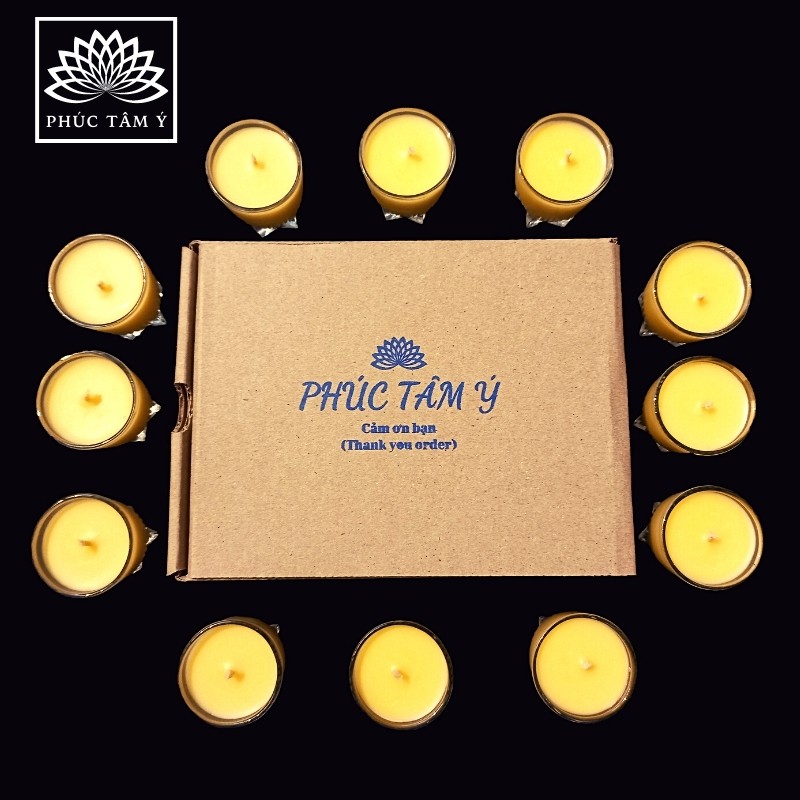Phúc Tâm Ý chuyên sản xuất các sản phẩm về nến từ Bơ Thực Vật, Sáp Ong, Sáp Cọ, Sáp Đậu Nành (nguyên liệu tự nhiên, an toàn cho sức khỏe): Nến tealight, nến ly thờ cúng, nến thơm tinh dầu,...
