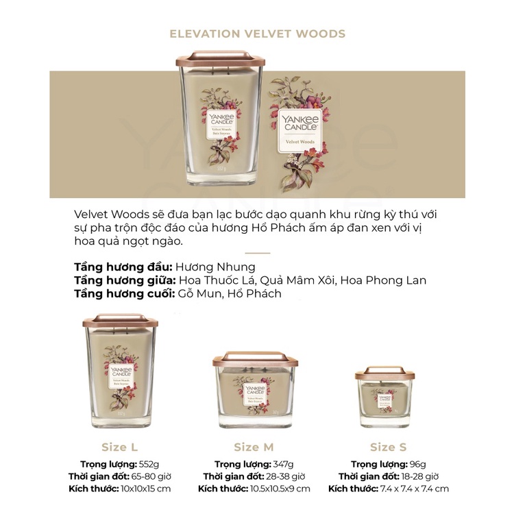 Nhà cửa & Đời sống > Trang trí nhà cửa > Nến & đồ đựng nến || [Mã LIFEMALL991 giảm 10% đơn 99K] Nến ly vuông Elevation Yankee Candle size S - Velvet Woods (96g)Còn hàng