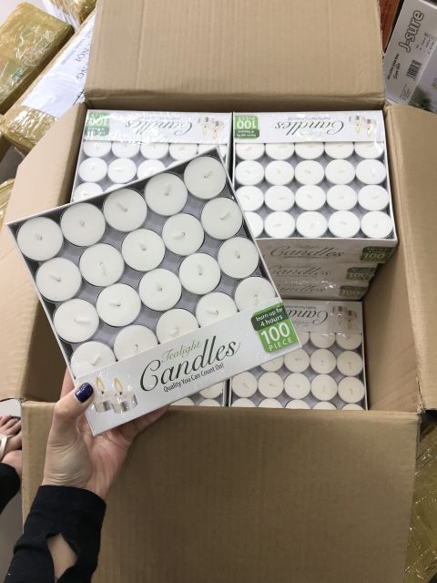 Nến tealight trắng 100 viên. Dùng cho nhà hàng, khách sạn, sinh nhật, hẹn hò lãng mạn.Thành phần: sáp paraffin