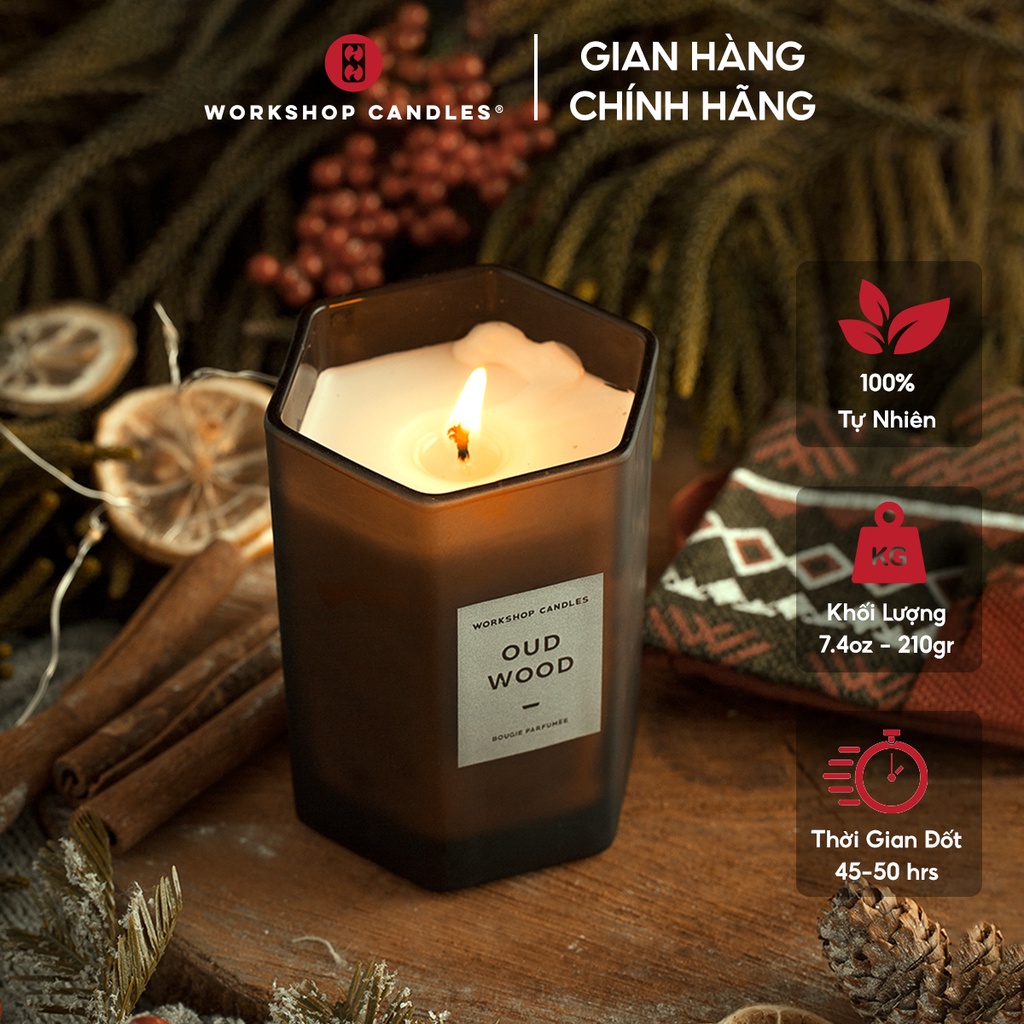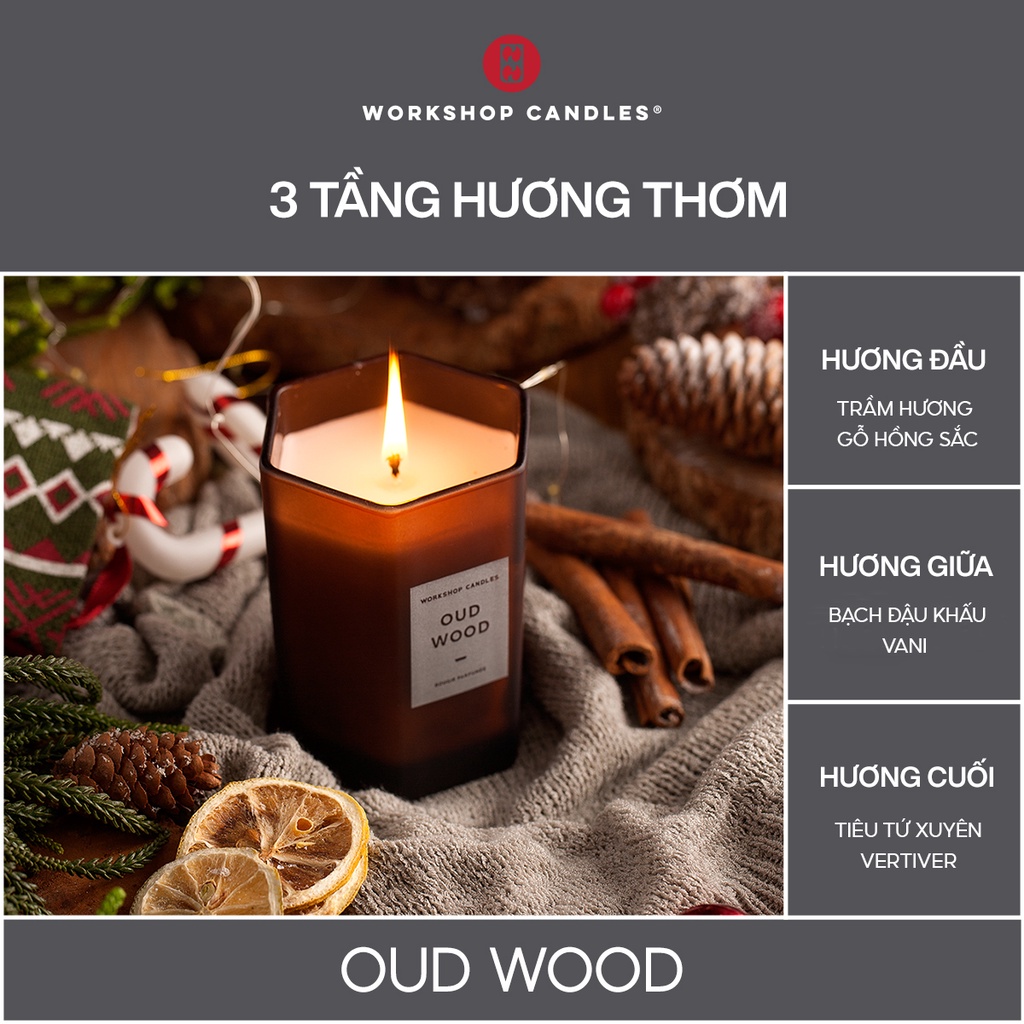 - Nến thơm Oud Wood Workshop Candles nằm trong bộ sưu tập nến thơm Perfume Candle Collection mang hương nước hoa sang trọng, toả hương cực mạnh với phòng diện tích lớn.